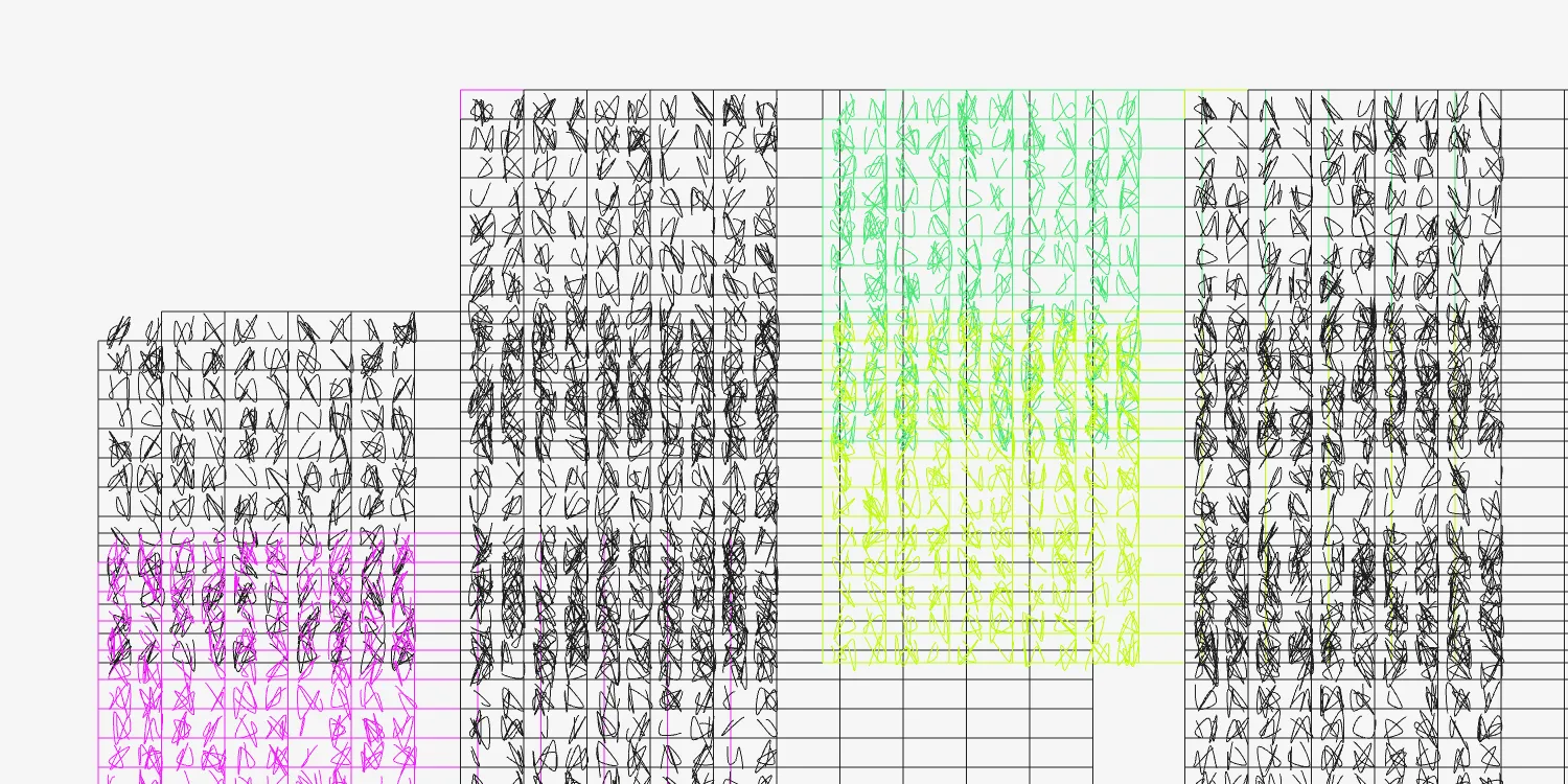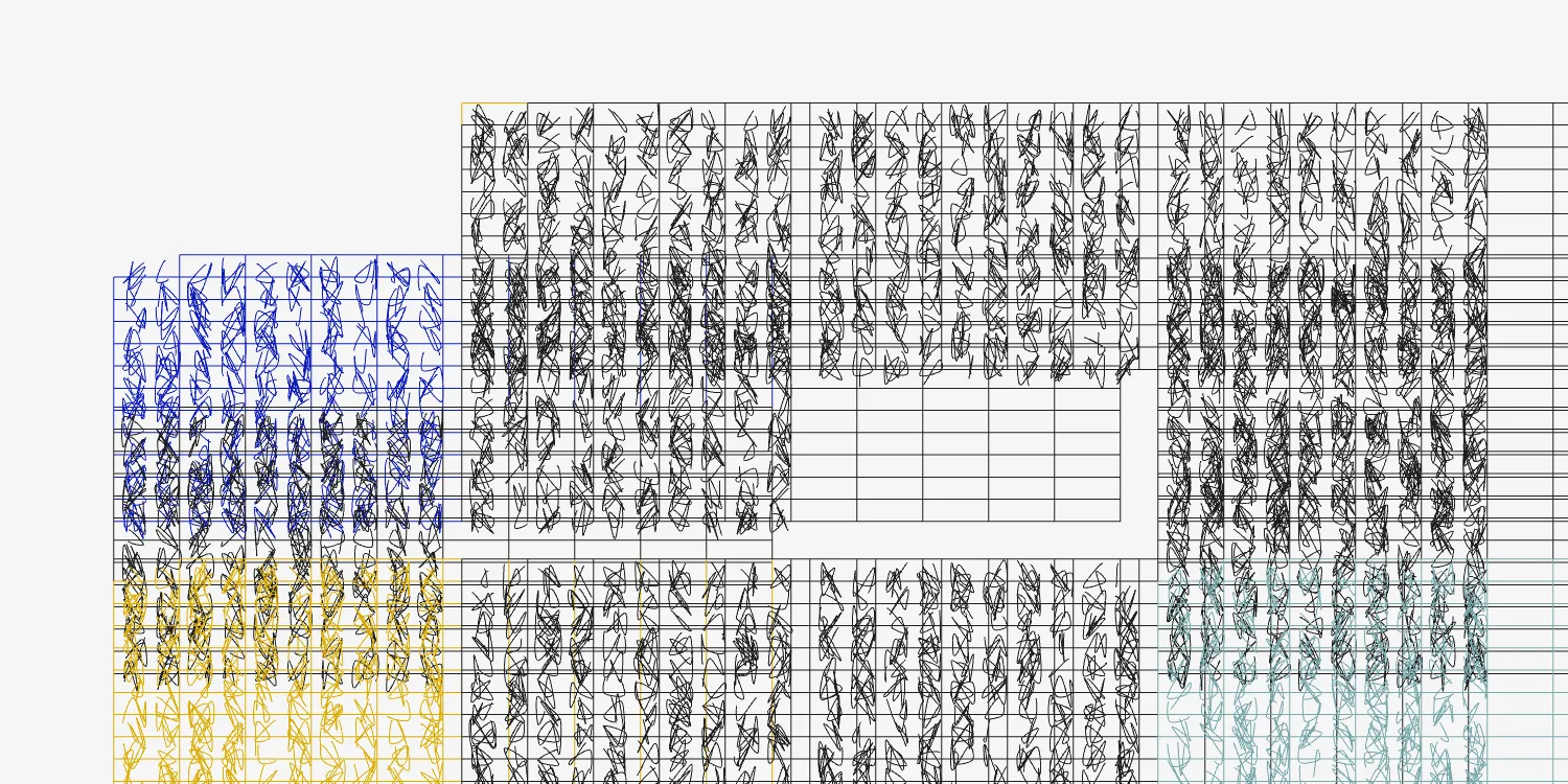 Grid studies was always a project where I tried to play around with variations in grid based systems. It started without having a goal but then I really liked those grids. I started making them in oil paintings. Experimenting a little bit with that and then it was just pencil with all paint over it to fill in and color the grids. But then you also get the pencil lines moving around with the paint, getting a vague line from the pencil. That really inspired me to try to replicate it in code, so in most of those pieces you can actually see colors moving around trying to recreate that effect. It's really interesting how you can play with symmetry and at the same time break symmetry and keep the whole process interesting. Grid studies was really an experiment around variations with grids.